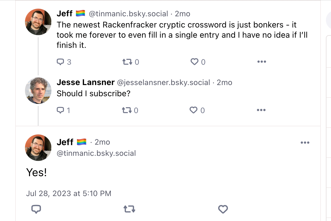 We only email you when we have a new puzzle — we'll put links to our latest shop talk posts and other news in those puzzle emails, and we always announce everything as it happens on Bluesky @therackenfracker.bsky.social and on Threads @therackenfracker.