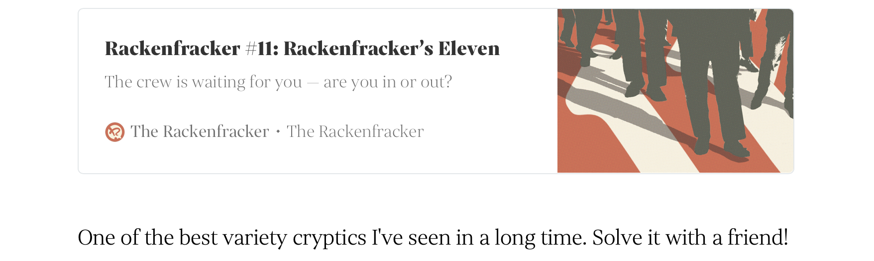 The Rackenfracker publishes US cryptic crosswords by dadgumituh and jmsr525, whose puzzles have also appeared in AVCX, The Gnomon, Cryptic Crossweird, Out of Left Field, and The Browser, and whose clues have been featured on Minute Cryptic. The Rackenfracker is also the first-ever winner of "Best Variety Cryptic Crossword" from the annual ORCA crossword awards. Subscribe today to get an exclusive puzzle emailed to your inbox every month, as well as free puzzles as we release them. Plus, you'll always be able to get the last four months of exclusive puzzles on the website.