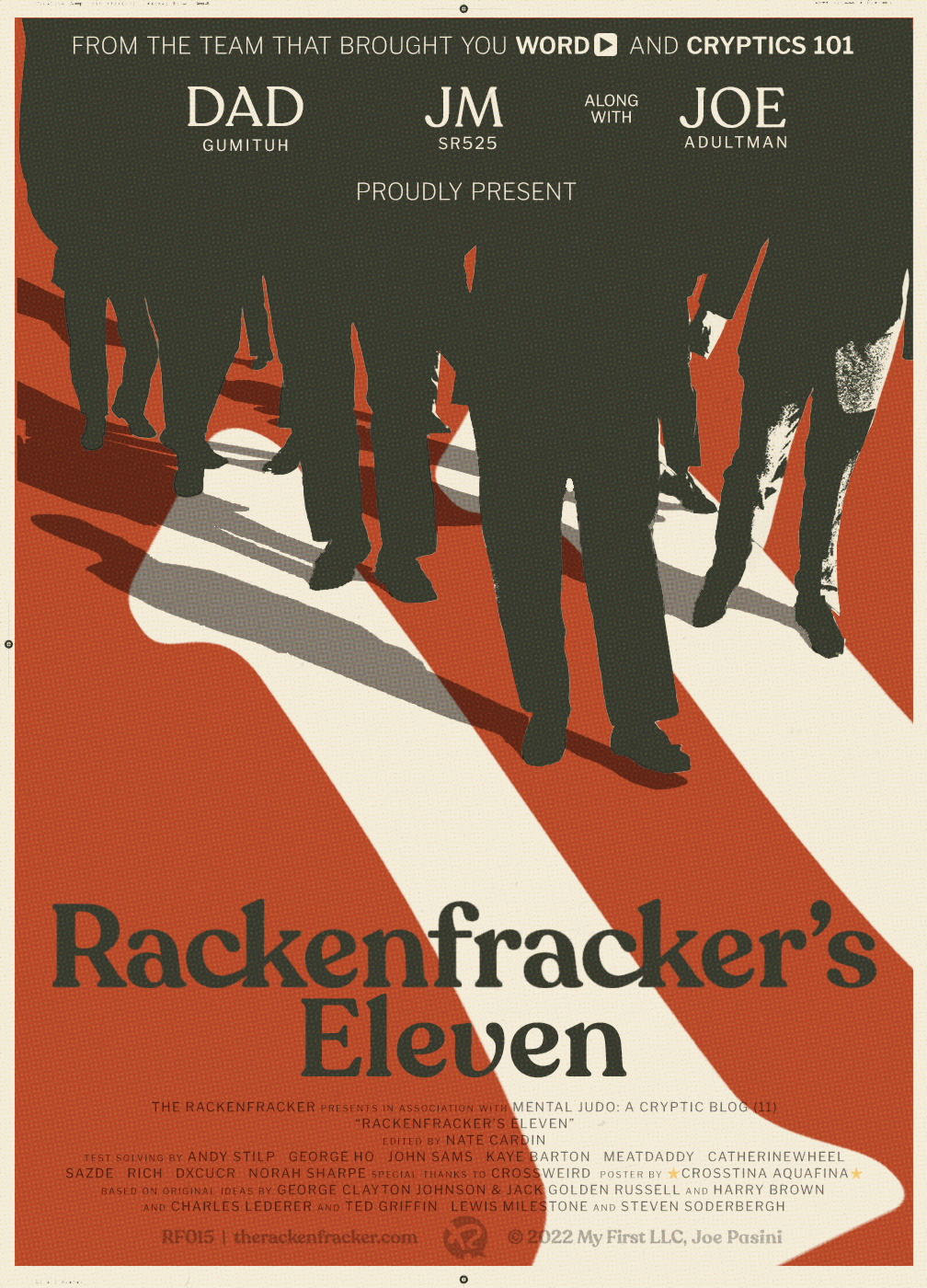 If there's one thing the two of us love, it's mixing it up with collaborators. Three's no crowd when it comes to shaking up our routine, our perspective, and our bag of tricks — such synergy can make a puzzle four-dimensional. Once we saw the awesome synchronicity with the calendar if we postponed release until today, we all high fived, but having to sit on the puzzle has had us at sixes and sevens because we didn't want to weight. And so we're on cloud nine to finally present the puzzle we've been on tenterhooks to share: Rackenfracker's Eleven.