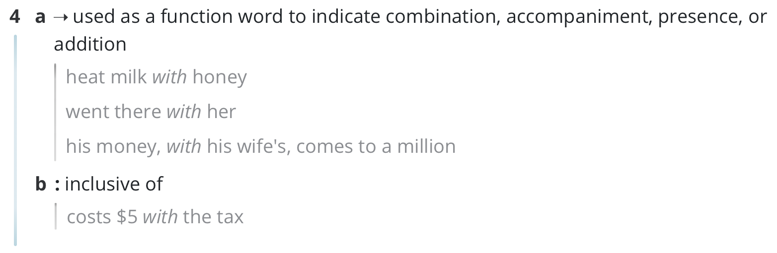 And so, going back to with, we have to DQ its container nature as well. You could say that 4(a) accompaniment and 4(b) inclusive of mean that with is both charade and container, but we hold fast to our principle that for the sake of cleanness and thus your solvers' happiness, those two categories shouldn't overlap.
