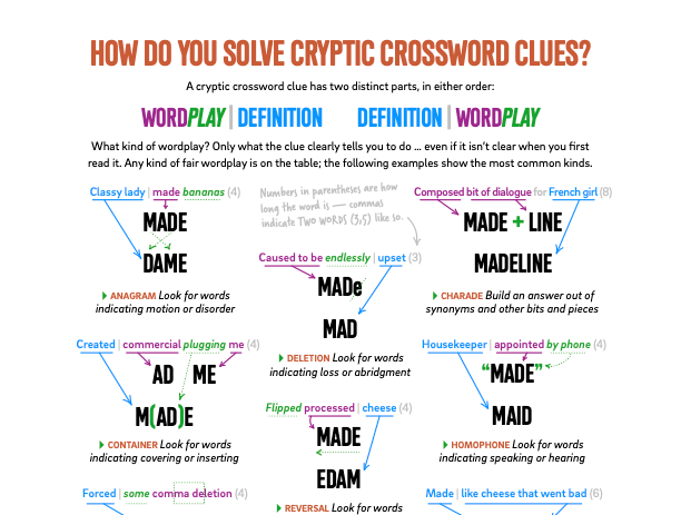 The Browser has a highly interactive guide to solving cryptics, which makes the experience a game. Twitch legend elderism‘s new guide to cryptics for a new solver is invaluable, though its UK provenance means some of its finer points may not be universally applicable. Stella Zawistowski at her Tough as Nails blog did a very deep, very useful dive into each clue type. Thanks to all for developing and pointing us to these resources.